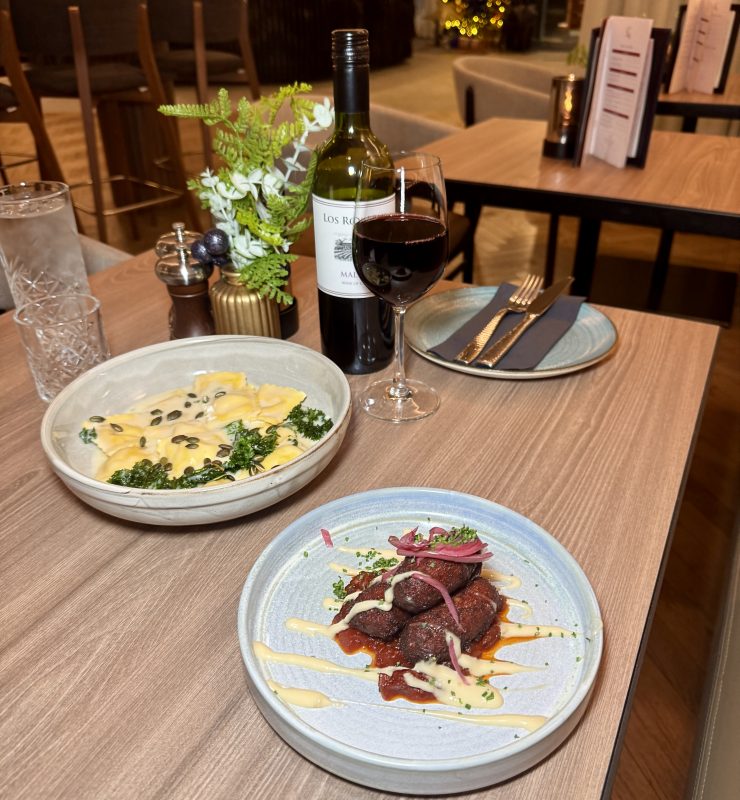 With a range of small plates priced at 3 for £18 or individually priced and a larger plates menu, I enjoyed cauliflower cheese croquettes with tomato relish, creamy garlic mayo and sharp pickled onions which were a tasty snack to start. Winter squash ravioli was a filling main course with each pocket of fresh pasta stuffed with spinach, parmesan and crispy sage topped with a sprinkling of toasted mixed seeds for added texture.