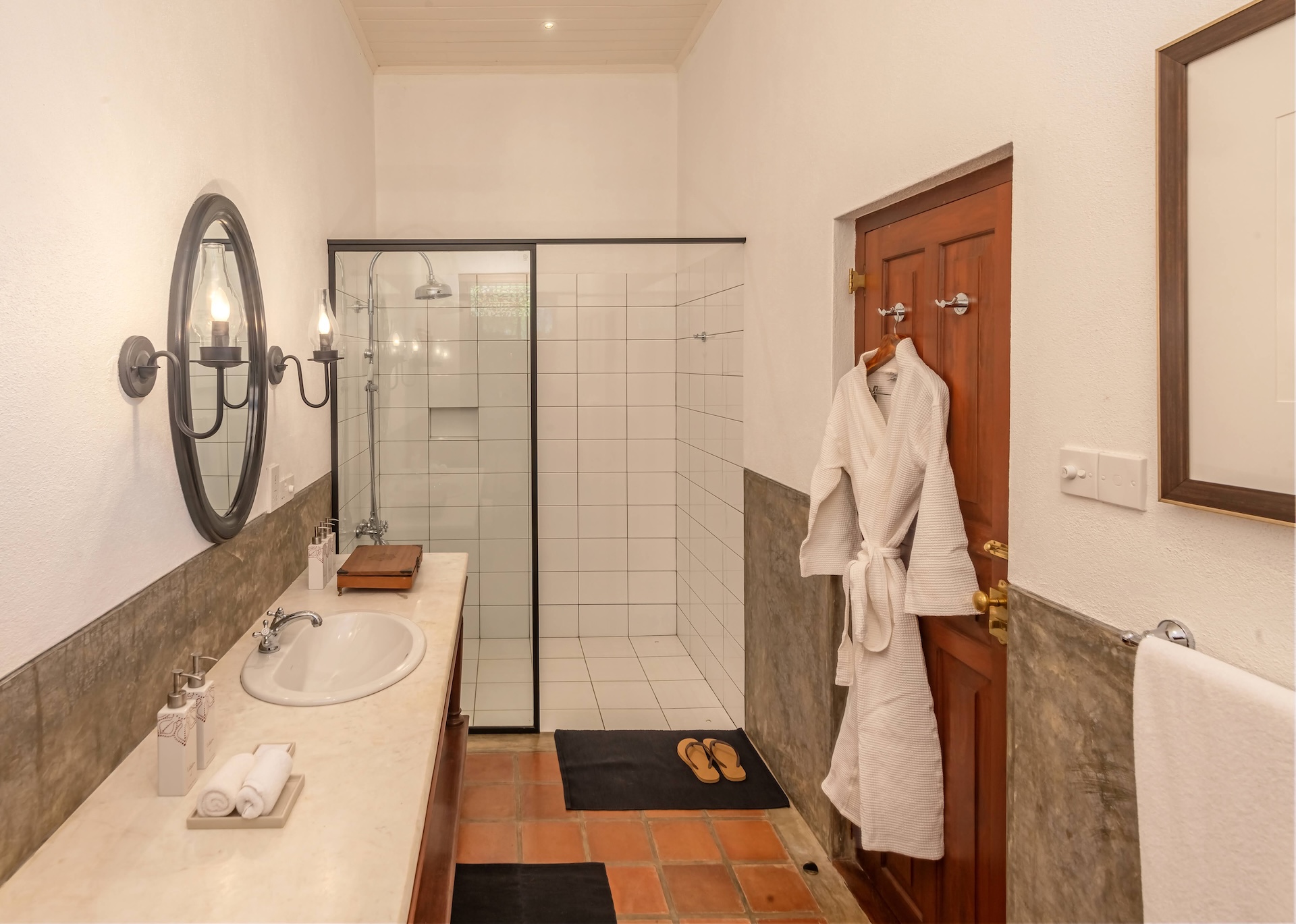 With space for two suitcases, large wardrobe, queen sized four poster bed with elegantly hung mosquito nets, the bathroom boasted a huge walk-in shower, sink and vanity area. The beautiful tiles helped to keep the bathroom cool, while the delightful smelling complimentary toiletries added to the overall luxury, along with fluffy bathrobes and slippers to throw on after a refreshing rainfall shower.